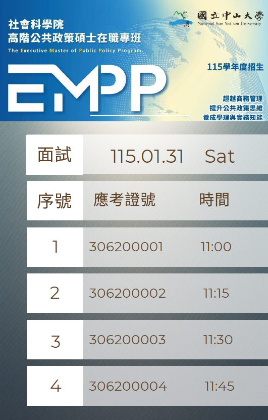 115學年度國立中山大學社科院高階公共政策碩士在職專班(EMPP)入學資格審查暨面試評分標準公告: